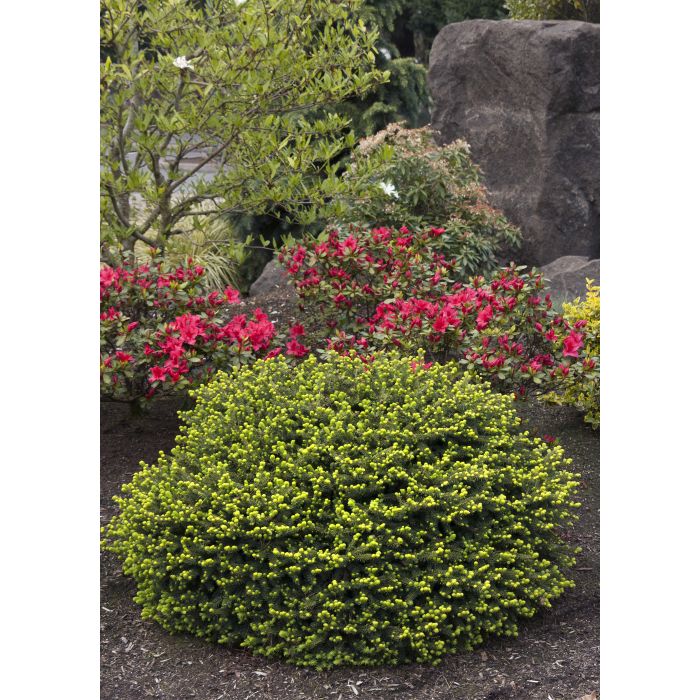 3-4′ Tall by 4-6′ Wide Blue-green needles year round Full Sun to Part Sun Slow growing, globe shaped, low maintenance